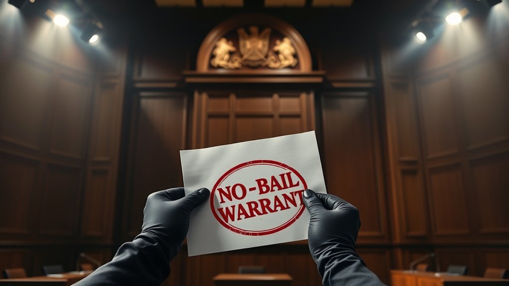A no-bail warrant is a court order that requires a defendant to be detained without the possibility of posting bail. It’s issued by a judge or magistrate, often before formal charges are filed, based on statutory criteria or a prosecutor’s request. Once issued, no amount of money can secure your release while the warrant is active. The court determines that the defendant poses a danger or flight risk, making bail inappropriate. Federal authorities also issue no-bail warrants under specific circumstances. When you’re subject to one, you’ll stay in custody until the court lifts the order or your case concludes. You have the right to challenge the warrant through a hearing, but until then, you remain detained without the option of bail. Understanding detention procedures can help clarify the reasons behind such warrants and the legal options available. Additionally, detention procedures are guided by legal standards that aim to balance individual rights with public safety. Recognizing the criteria for detention can provide further insight into when no-bail warrants are used.