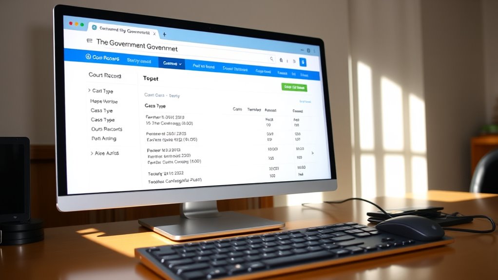 Federal court records are accessible online through PACER, the primary platform for obtaining court documents from the U.S. federal judiciary. To start, you’ll need to create a PACER account, which is quick and straightforward. Once registered, you can search for cases using case numbers, party names, or docket information across federal courts nationwide. PACER provides access to case summaries, dockets, and filed documents. Keep in mind, it charges $0.10 per page, so review your search results carefully. Some documents may be sealed or redacted, limiting access. To find specific cases, you can also use the PACER Case Locator if your initial search doesn’t yield results. Always verify details and contact the court clerk if you encounter inaccessible records. Understanding court record access can help you navigate the process more effectively.