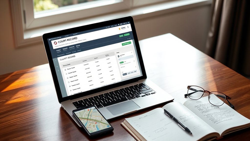 When viewing court files online or in person, safeguarding privacy and security is essential to prevent the misuse of sensitive information. You should be aware of the court’s protocols to protect personal data and maintain confidentiality. Always verify your access rights before requesting documents, especially sealed or confidential files. Use secure login credentials for online portals and avoid sharing login details. Be cautious about handling printed records, ensuring they are stored securely and disposed of properly to prevent unauthorized access. Additionally, stay informed about court policies on redacting personal information and follow procedures for requesting restricted records.