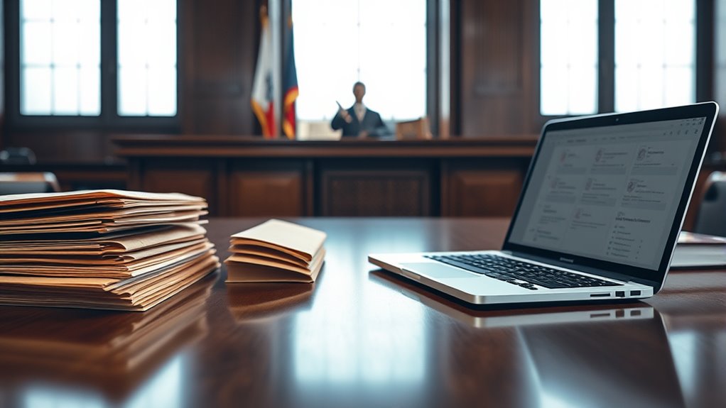 Moving to digital court records offers significant advantages that streamline legal processes and improve overall efficiency. You’ll experience faster retrieval of documents since files are searchable and accessible remotely, saving time and effort. Digital records also reduce the need for physical storage, freeing up courthouse space and lowering maintenance costs. Transparency improves as parties can track case statuses and access decisions online, fostering trust and accountability. Routine tasks like filing and scheduling become automated, decreasing workload and speeding up case management. Additionally, digital systems enable public access outside courthouse hours through online portals, making legal information more available. Implementing efficient general ledger coding practices can further enhance the management of court-related financial transactions and records. These benefits collectively enhance the court’s ability to operate smoothly, reduce delays, and better serve the needs of all users involved. Moreover, transitioning to digital records minimizes the risk of physical document damage, ensuring the longevity and integrity of important legal information. Incorporating digital record security measures helps protect sensitive data from unauthorized access and cyber threats. Proper data management also ensures that records remain accurate and up-to-date over time, while electronic record preservation techniques can help maintain their integrity for future reference.