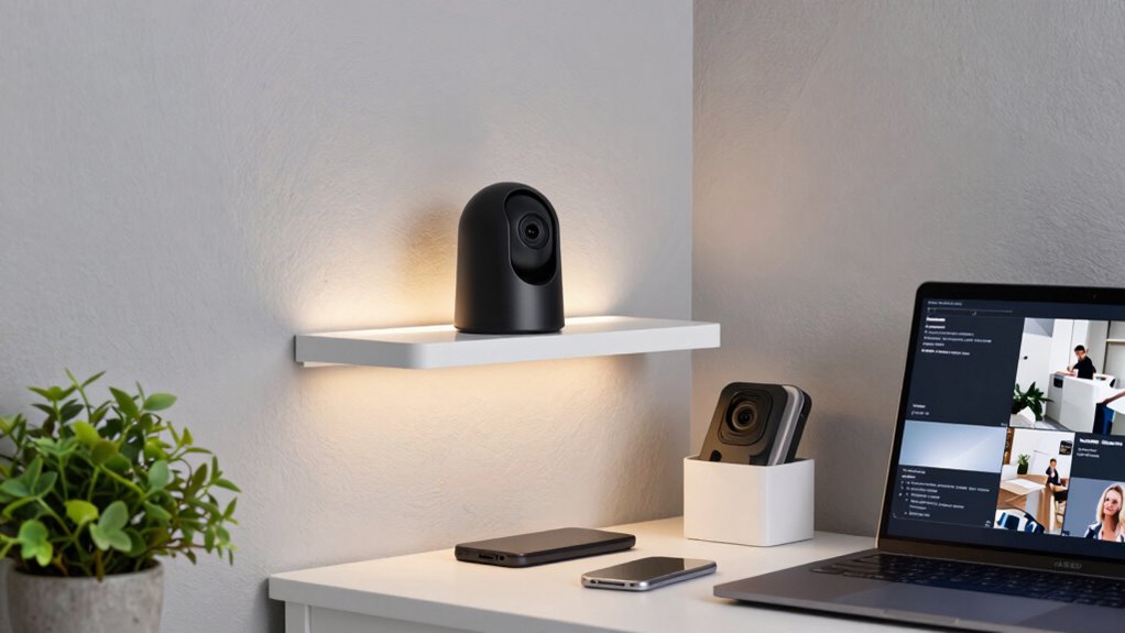 Setting up a home office security camera system can seem overwhelming, but choosing the right one doesn’t have to be complicated. The key is to focus on your specific needs and avoid overspending on unnecessary features. First, consider your privacy concerns. You’ll want cameras that offer secure data encryption and clear privacy controls, so your footage stays private and isn’t accessible to unauthorized users. Look for systems with customizable privacy settings, like the ability to turn cameras off when you’re working or during personal time. This way, you protect your privacy without compromising security.