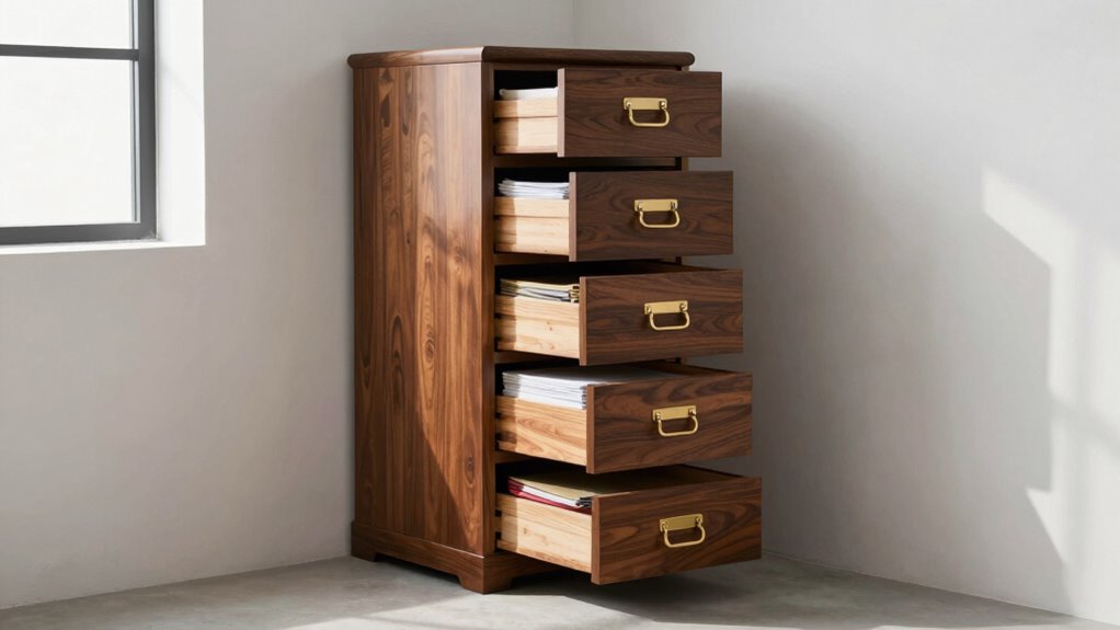 A filing cabinet can be fireproof if it’s made from fireproof materials like steel with special insulation. You’ll find fire-resistant cabinets designed to withstand high temperatures, protecting your documents from flames. Keep in mind, though, that cabinet durability varies; not all filing cabinets are equally fireproof. Look for models specifically labeled as fireproof and verify their fire rating to guarantee they provide adequate protection for your important files.