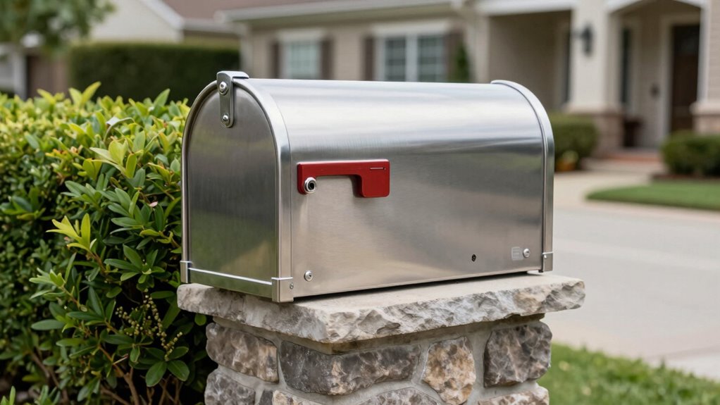 Like a knight’s armor, locking mailboxes are built to withstand the elements. They’re weather-resistant and durable, addressing security concerns by keeping your mail safe from rain, snow, and tampering. Material options like stainless steel, aluminum, and heavy-duty plastic guarantee they won’t rust or crack easily. You can trust their construction to last through seasons, providing peace of mind and protection for your mail day after day, year after year.